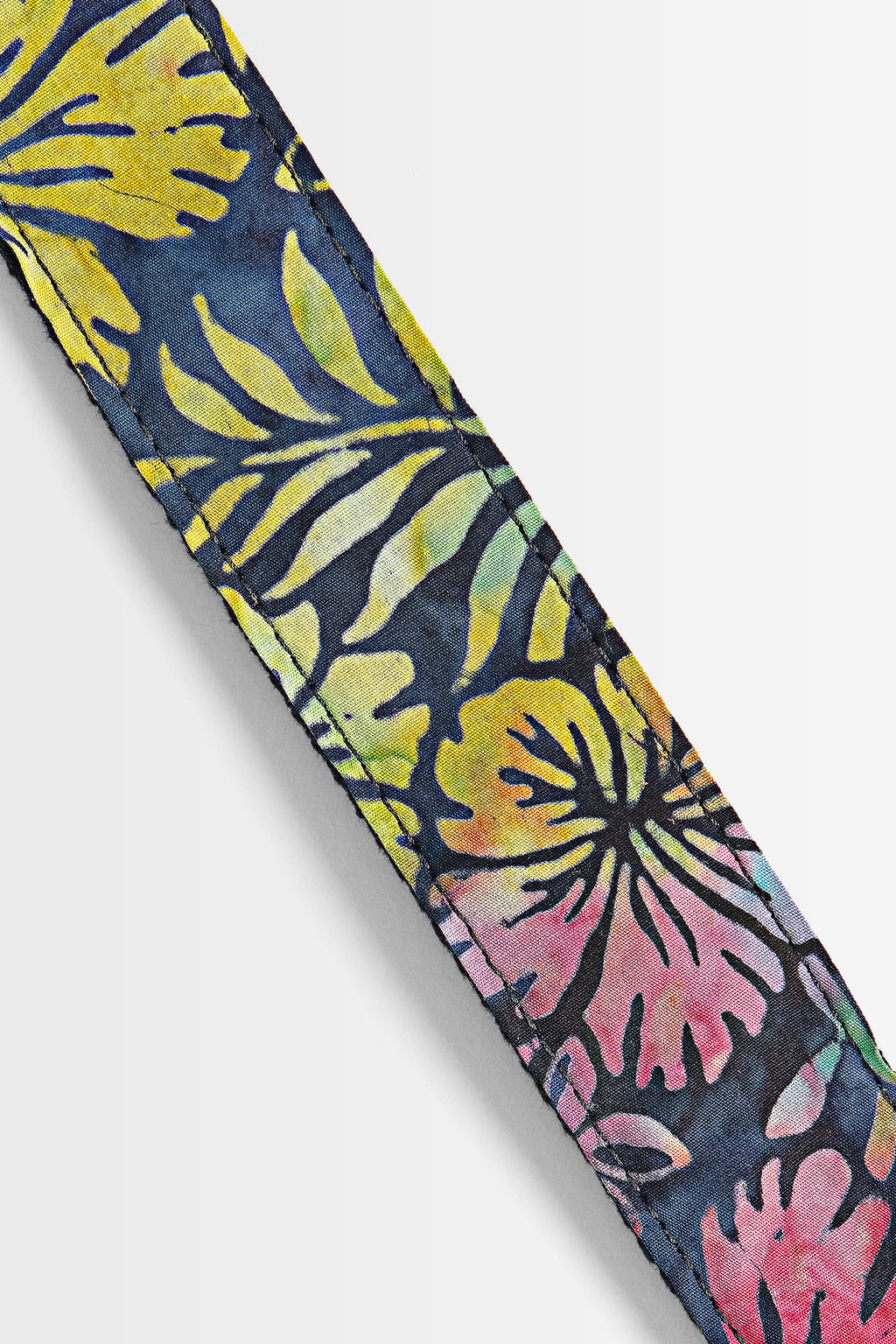 For players who embrace color and joy in their music, this vibrant strap bursts with rainbow hued hibiscus flowers that capture the spirit of aloha. Crafted in the USA from durable woven fabric, it adjusts to fit any ukulele and any player for comfort that lasts through rehearsals and performances. Dual strap button attachment points provide standard mounting options, while an included rope tie at one end allows for a headstock attachment option. Perfect for anyone seeking a strap that celebrates the ukulele's island heritage.