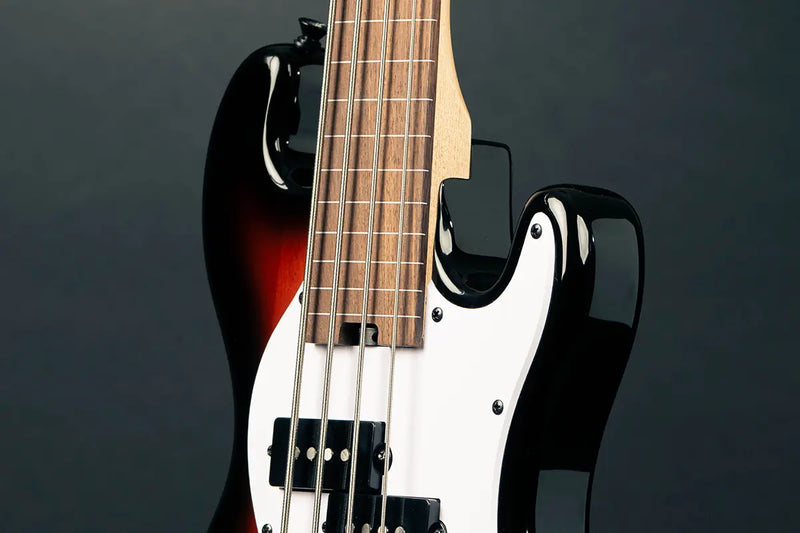 Smooth fretless expression with upright-like character. Split-coil pickup, offset contoured body for comfort. Standard 4-string in compact format.